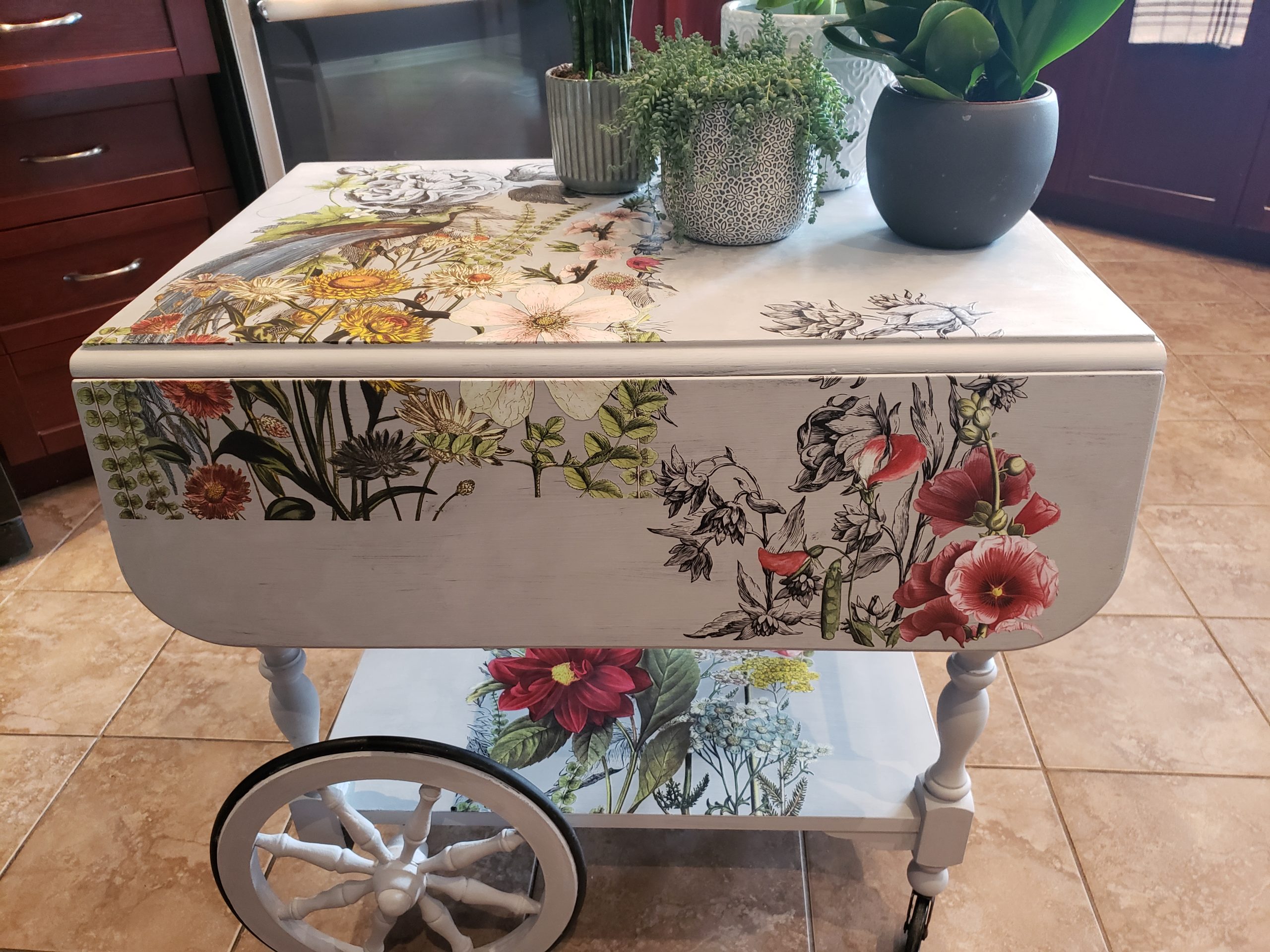 Here is a perfect example of a dated piece given new life with a fresh coat of paint and some floral decals.