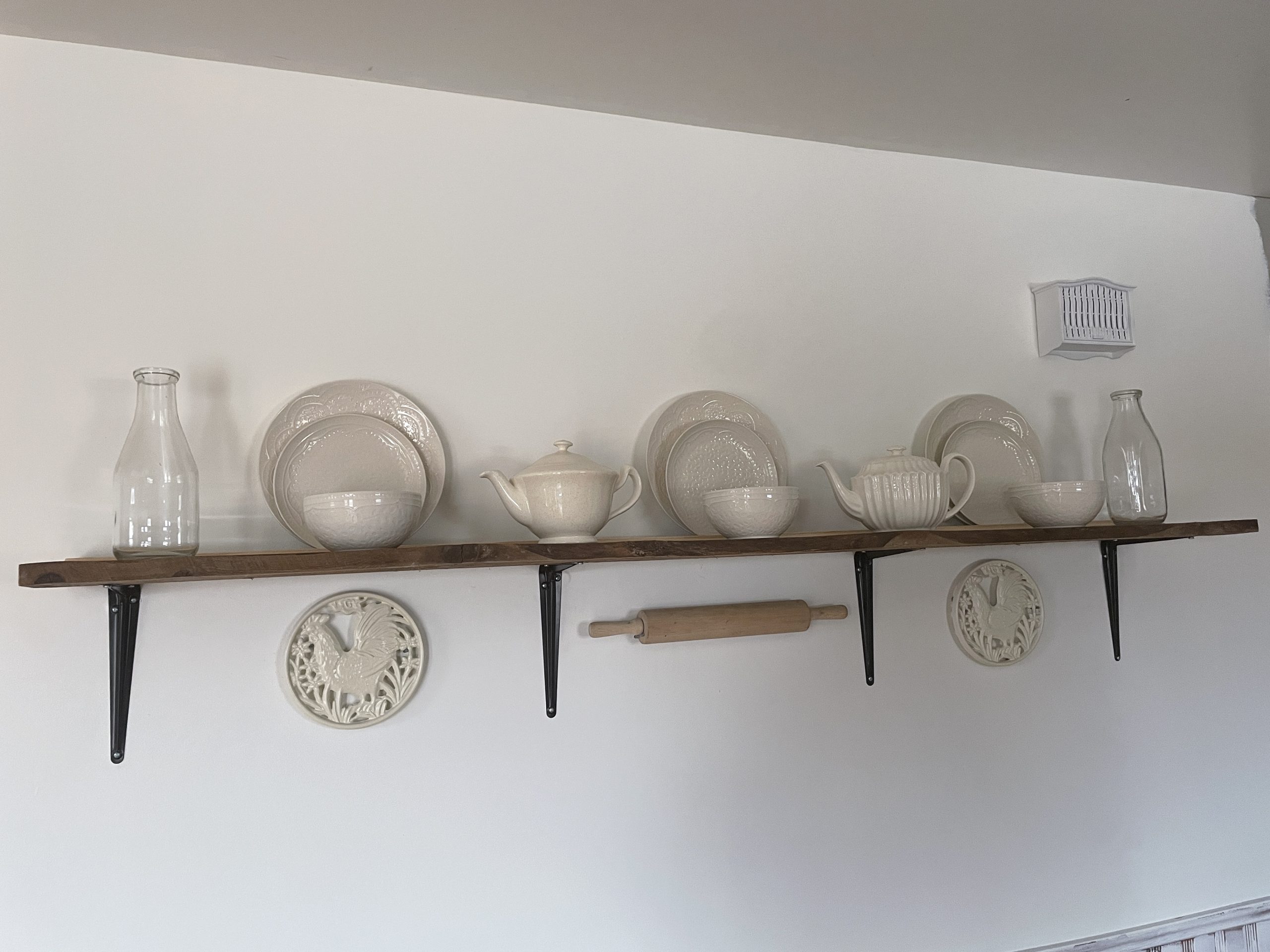 Barn board pieces made into perfect shelves for the kitchen