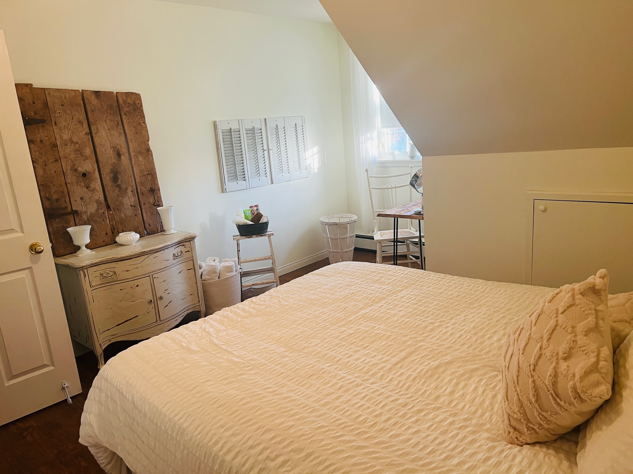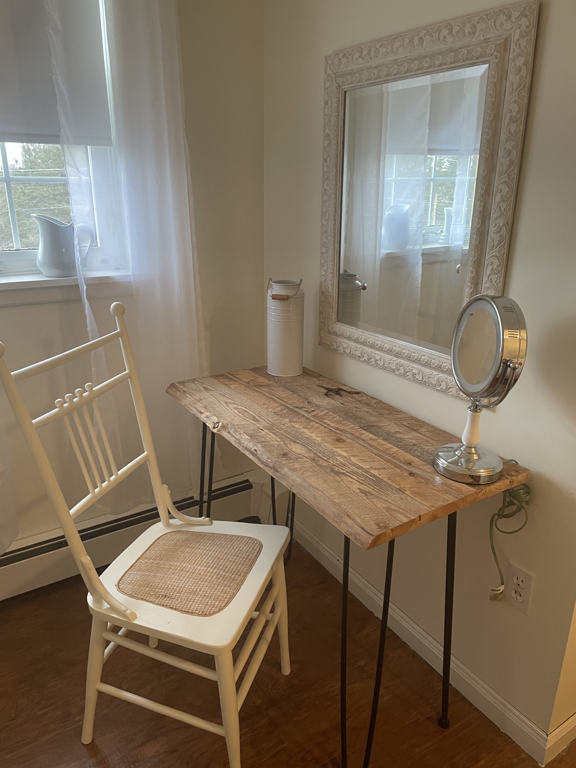 We added hairpin legs to a piece of barn board and voila, a unique table for the guest room
