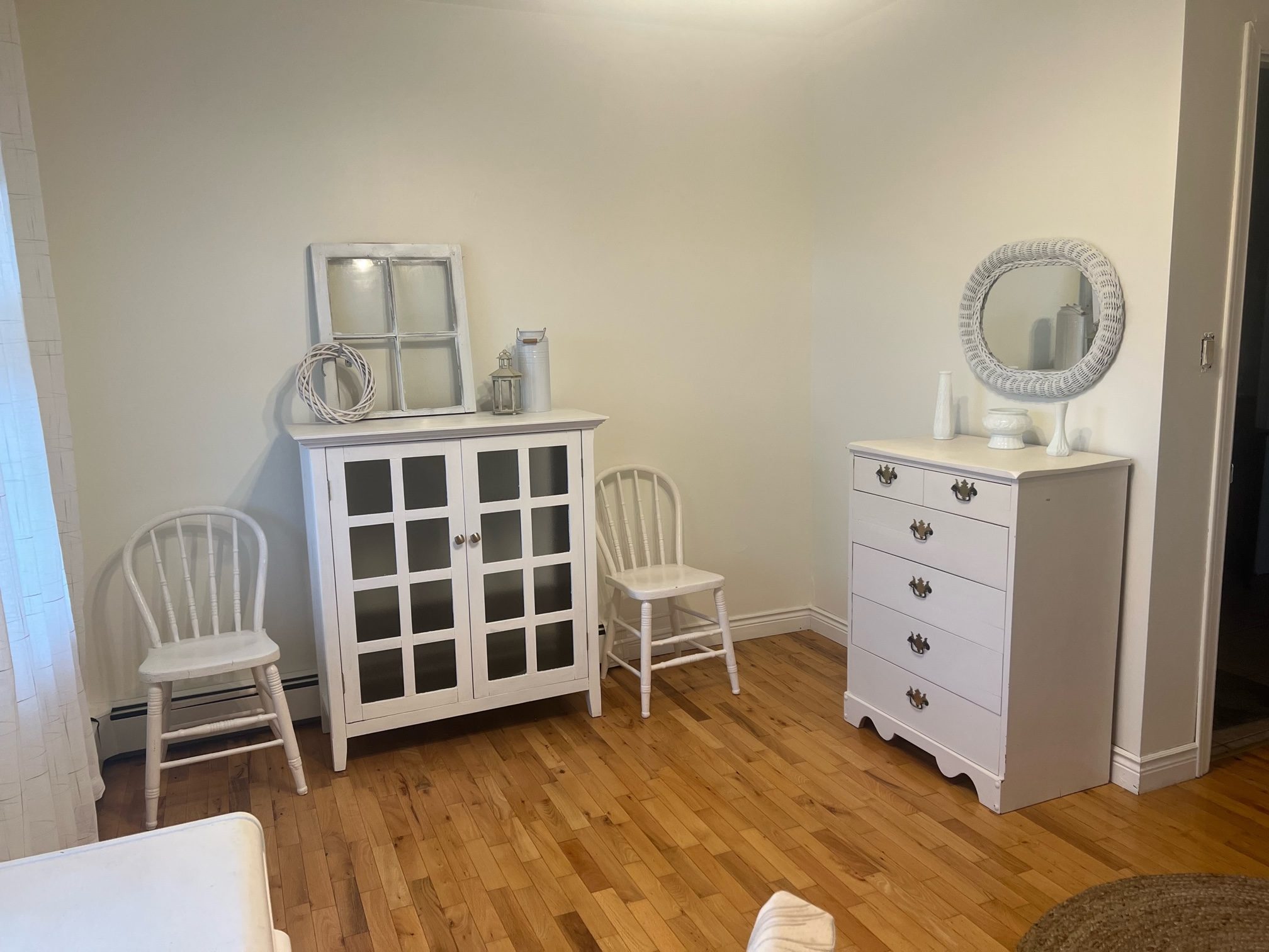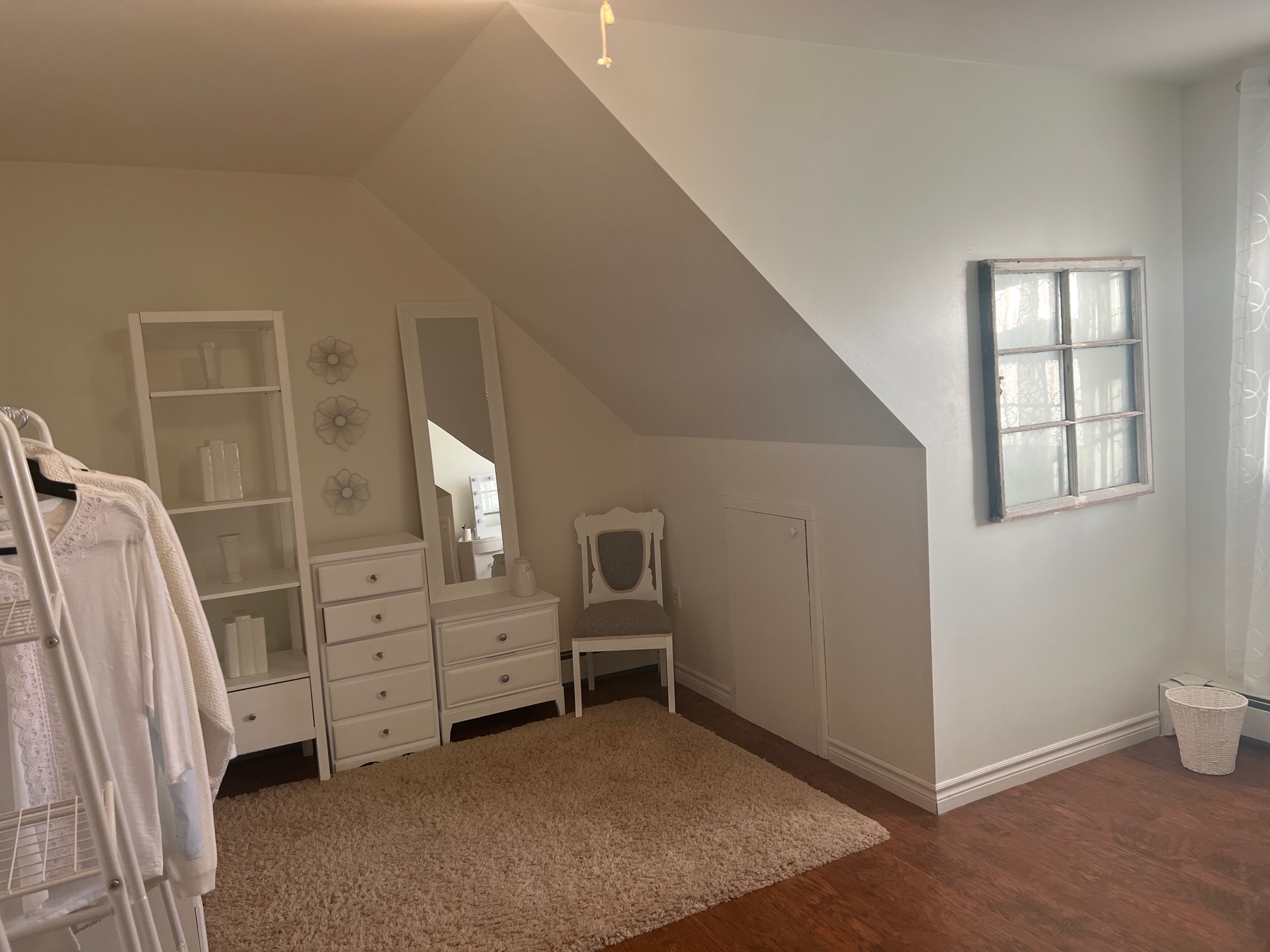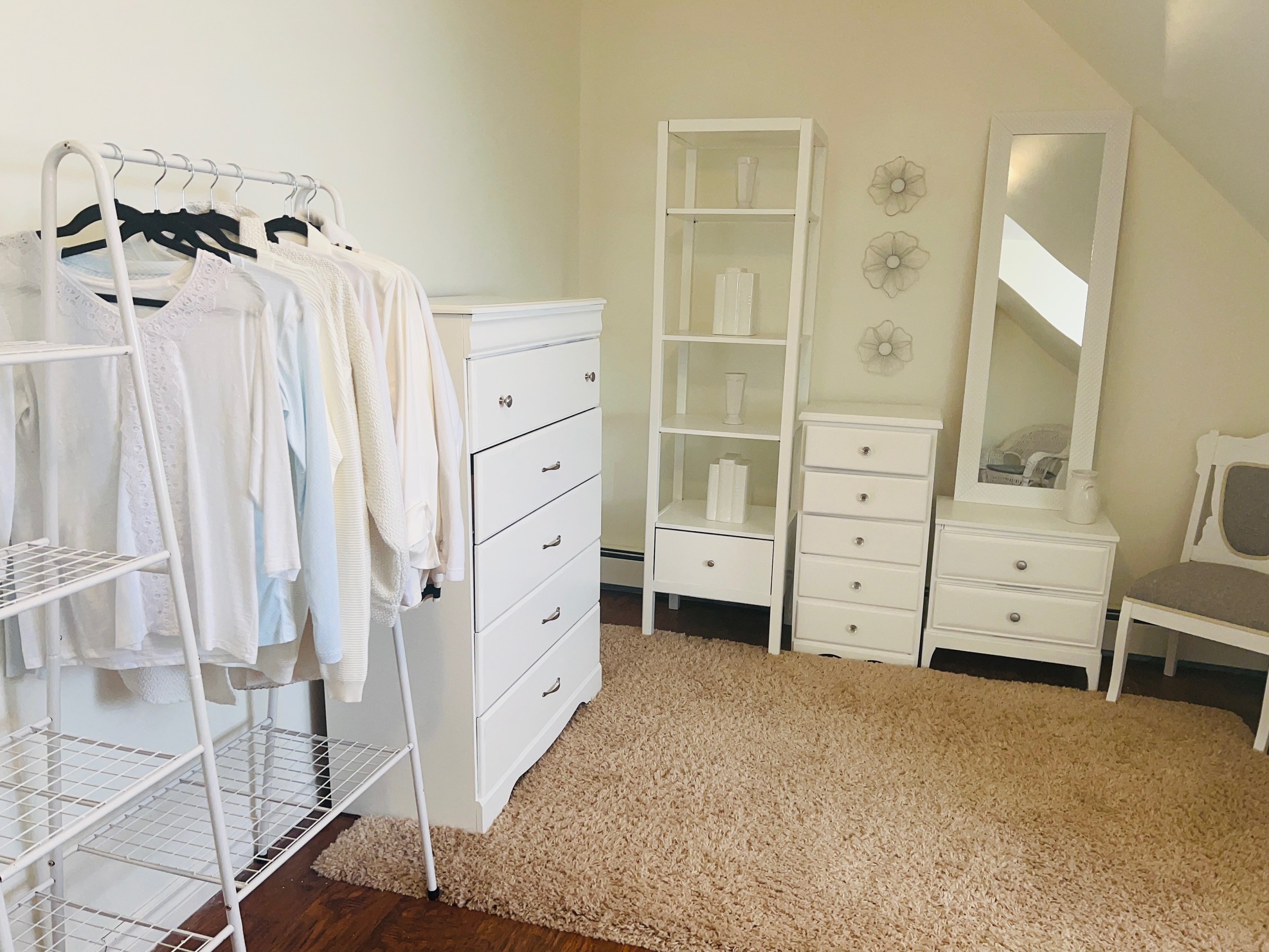 Her dream was to have her own dressing room, so we converted one of the bedrooms. The white pieces she picked up at yard sales, the wicker chair was free at the side of the road and the rug was added. All accessories were purchased at thrift stores. A perfect space for her to get ready for the day!