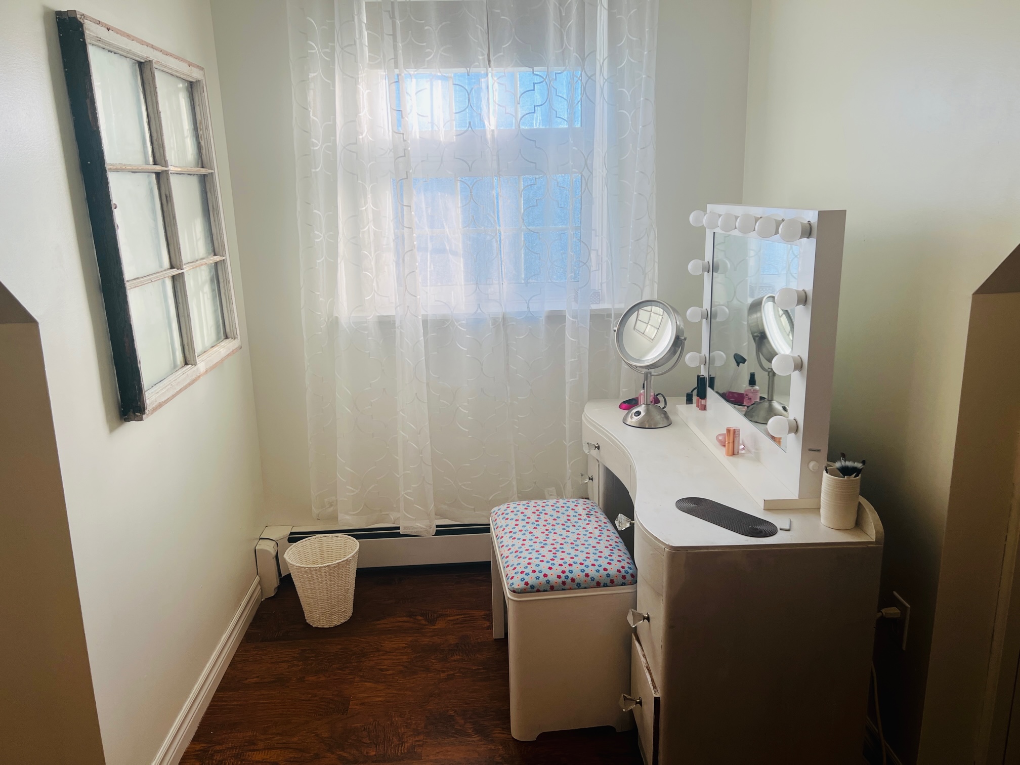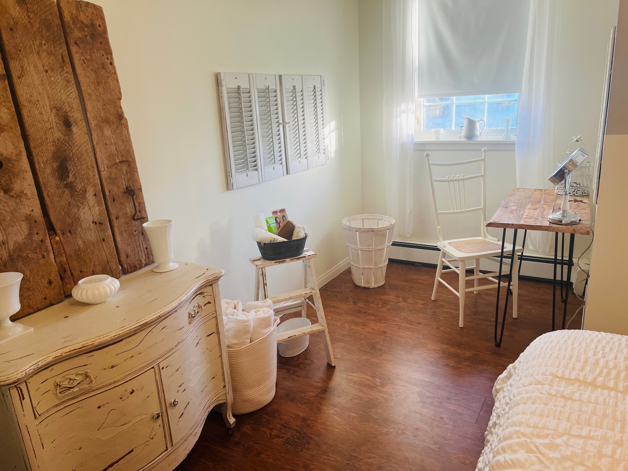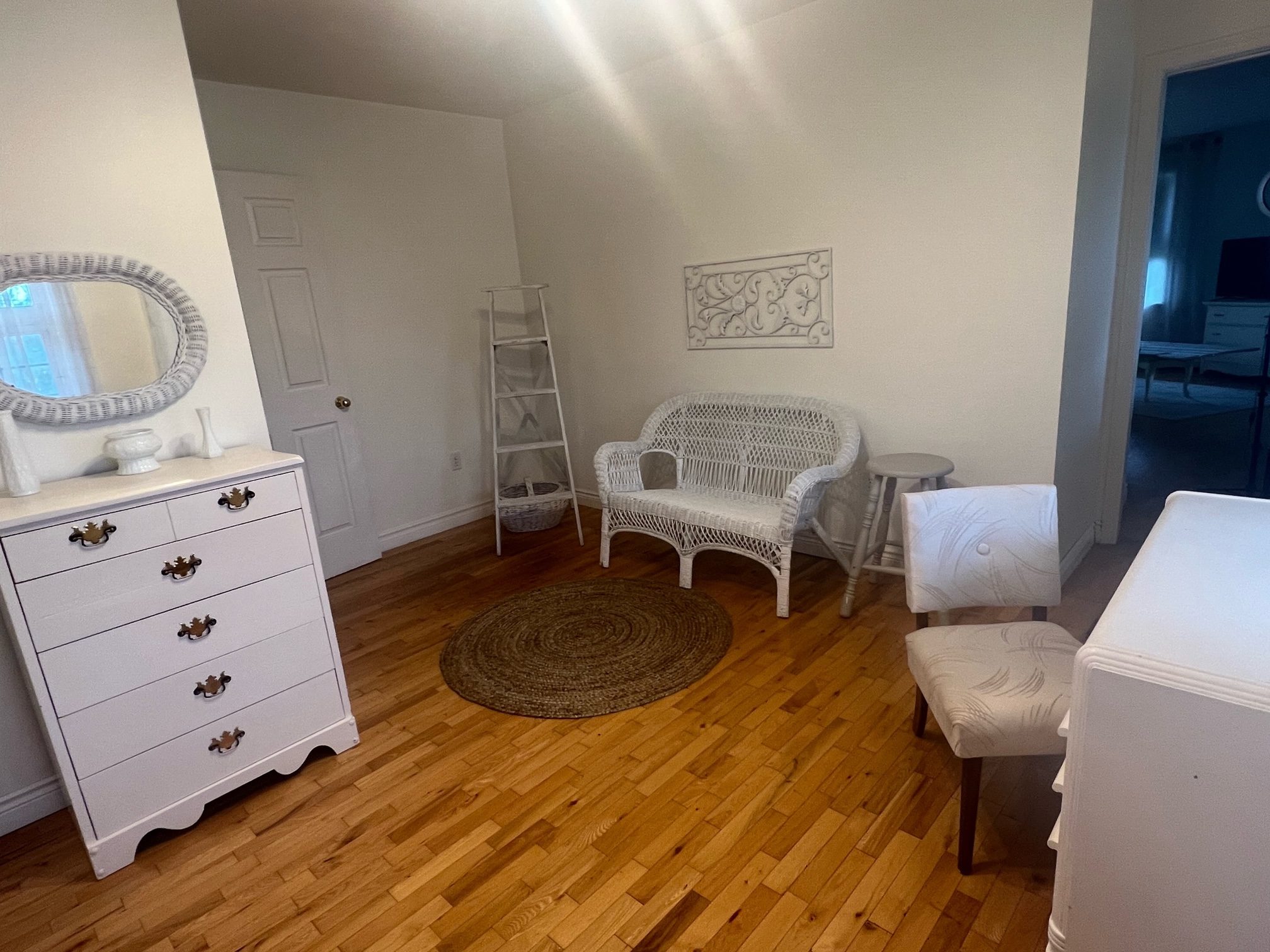 Her dream was to have her own dressing room, so we converted one of the bedrooms. The white pieces she picked up at yard sales, the wicker chair was free at the side of the road and the rug was added. All accessories were purchased at thrift stores. A perfect space for her to get ready for the day!