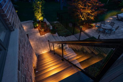 When lighting stairs, it’s important that every step is illuminated. The eye is drawn to what is lit, and therefore consistent lighting prevents missteps. This staircase is a visually stunning feature that also ensures safe passage from the home’s interior to exterior, even in the dark.